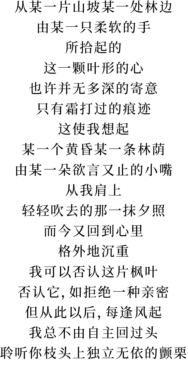 这一次来美国,美国水化学公司赠送我们每人一本“绿卡”,皮面写着 WISCONSIN PASSPORT United States of America(美国威斯康辛州护照)实际上是一本小册子,里面有对该州的介绍:其中这里的STATE TREE(枫树)最有名,与相邻的加拿大一样都出产枫树,这种树的叶在秋天变成红色,红叶的秋色十分漂亮。美国朋友赖格纳告诉我们这种枫树叫“甜枫”,是威斯康辛州的州树,是1893年由该州的少年儿童发起投票而选中的,这种树高达104英尺,树围可达165英寸,虽不够该州的白松高(可达148英尺)树围(354英寸)大,但由于它风姿卓卓,秋叶红润,特别受到当地人的青睐。可惜我当时没有拣一片枫叶留作纪念。据说树叶中都含有叶色素,但枫叶含的色素会因气候变冷,特别在打霜之后因树叶变成酸性而变红,所以自然界真的十分奇妙。看到眼前的红叶我想起当代诗人舒婷1980年4月写的一首小诗《枫叶》: