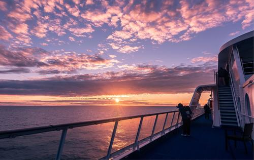 还不到早上五点就醒了,也不敢再睡,怕过了看日出的时辰,几个人来到甲板上向船头走去,因为船是向东行驶的,看海上日出得到船头。这里已经聚集了不少人,真是“莫道君行早,更有早行人。”初冬的晨风有些刺骨,但大家兴致很高,为暖和身子,有的人不停地跺脚。这时在前方无边的大海中已见一丝鱼肚白,不久在东方水天相接处,忽然显出红光来,那光渐渐地肥大,成为一个通红通红的大红火球,浮沉、摇荡在海平线上。一会儿那红日突然从海面上跃出,只见红霞满天。那红日半露时最大,也最美,到太阳升高,天色更明时,太阳也变小了,变得更刺眼,使大家不敢正视它,海上观日出我还是首次。