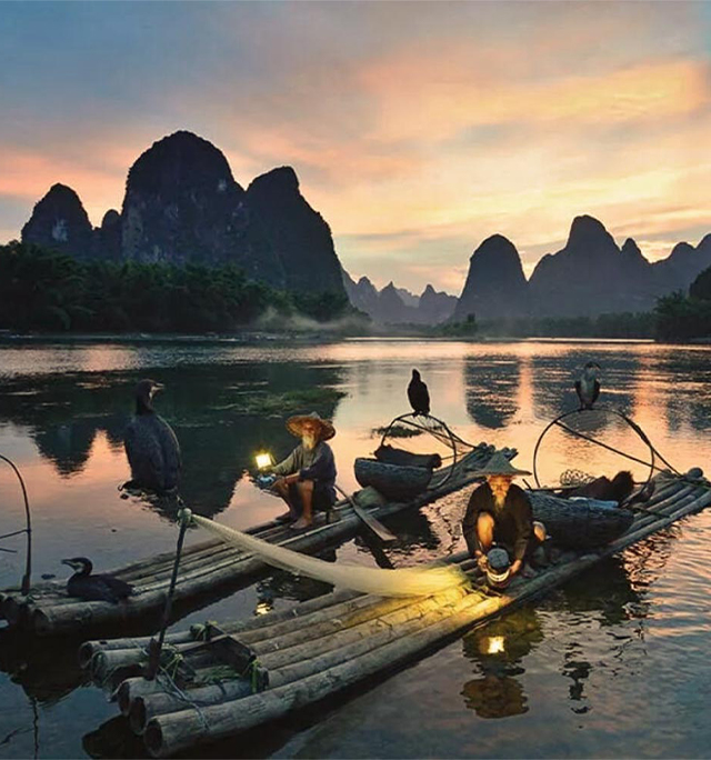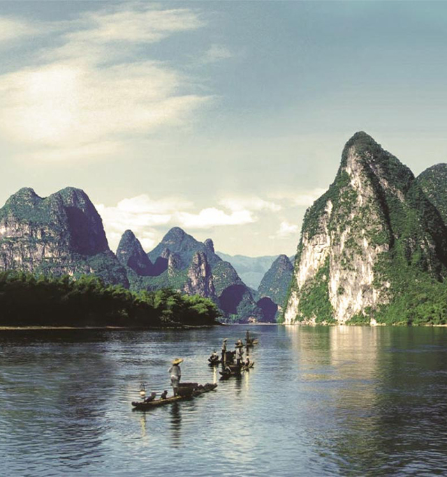 船到兴坪,这里是漓江风景的精华,“云青青兮欲雨,水澹澹兮生烟”山影水景在细雨朦胧中更好看,只见九马画山、螺蛳山、五指山、鲤鱼山,倚江而立,江水中是这些山清新美丽的倒影,天光云影徘徊在千峰青峦之间,溪中行舟像是一个“分明看见青山顶,船在青山顶上行。”的旅程。漓江画廊又像是一群无忧无虑的少女,尽显青春年华,喜笑怒骂皆是文章。