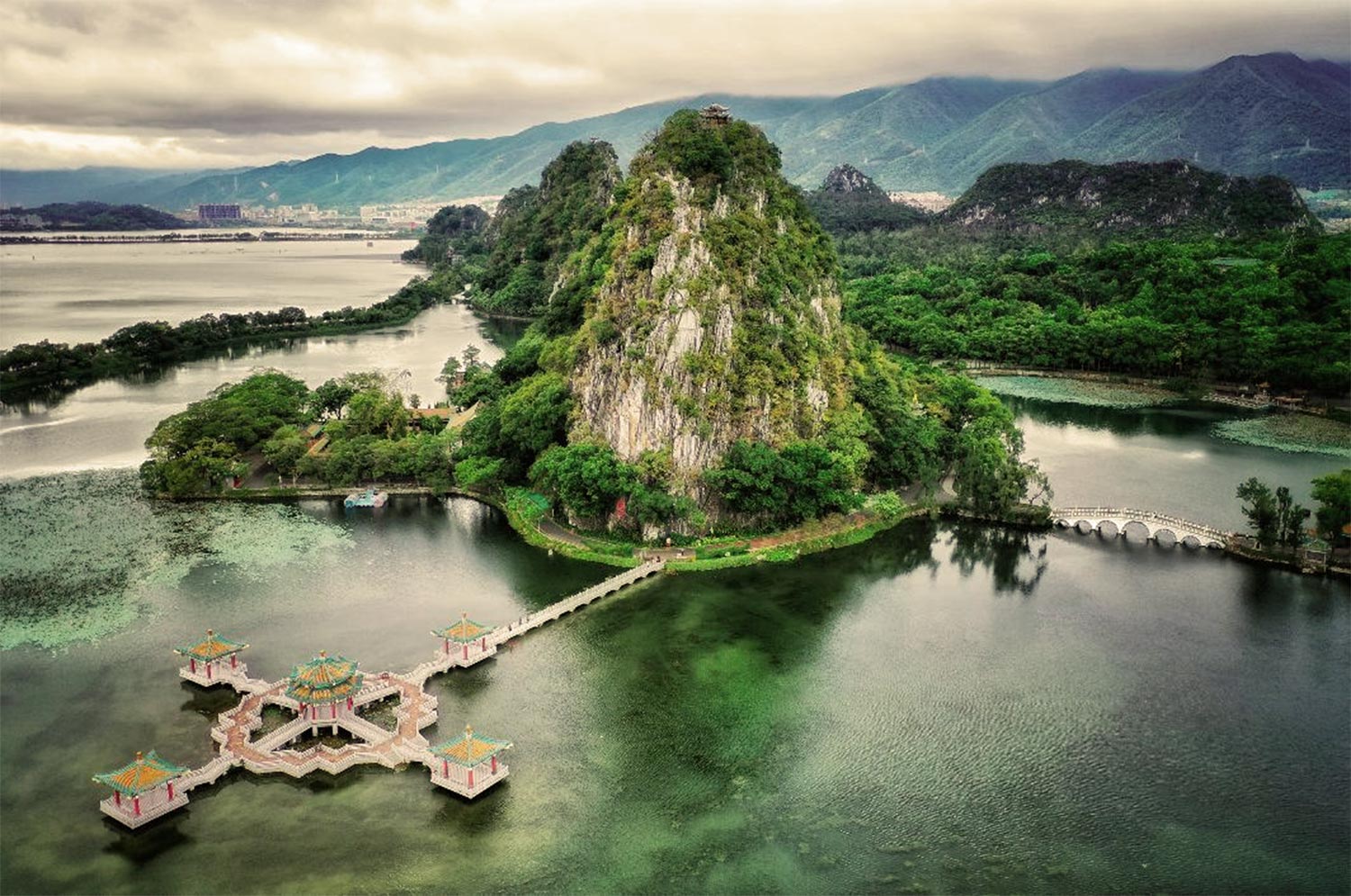 我们在山顶休息片刻便下了山。山下的水边有一条画廊连接着七座山峰,像是一条飘逸的彩带,这里湖泊和石山峰林错落,烟雨弥漫,十分迷人,如仙山琼阁,太虚幻景,身处此景,常会忘却烦恼,真不知今昔何昔。这里一年四季都有盛开的花卉,春天迎春花开了;夏日水中绿荷间,出水芙蓉探出头来;秋季更是桂香阵阵,菊花谢时,满城尽带黄金甲;冬末梅花正在丛中笑。