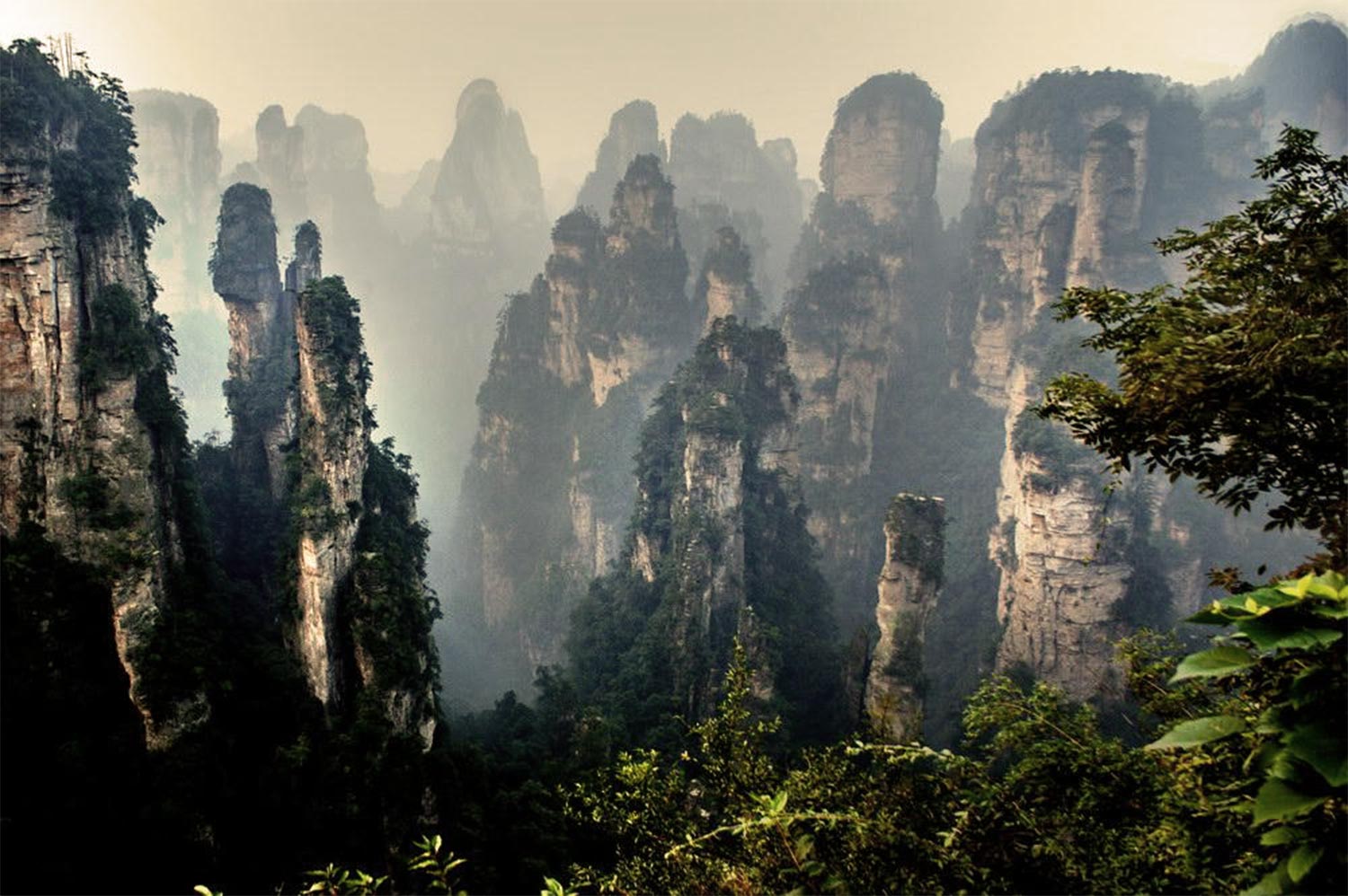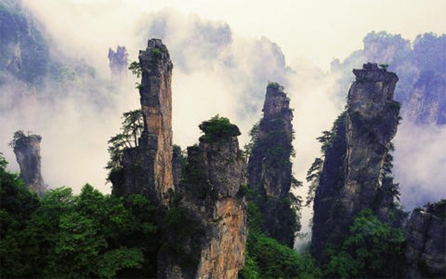 进山前有一雕塑,写着江泽民1995年的题字:“把张家界建设成为国内外知名的旅游圣地”。进山第一景叫猪八戒照镜子,位于金鞭溪与花溪交汇处,再向上右有龙女峰,左有雄狮起舞。张家界境区内奇峰连绵,怪石高耸。根据山形和人们丰富的想象,给各处景点起了很多富有诗意和神话色彩的名称:神鹰护鞭,醉罗汉,山荷花,双枫醉秋·····在山远处,只能在弥漫的云雾间隙中才得得以窥见它们的芳容。