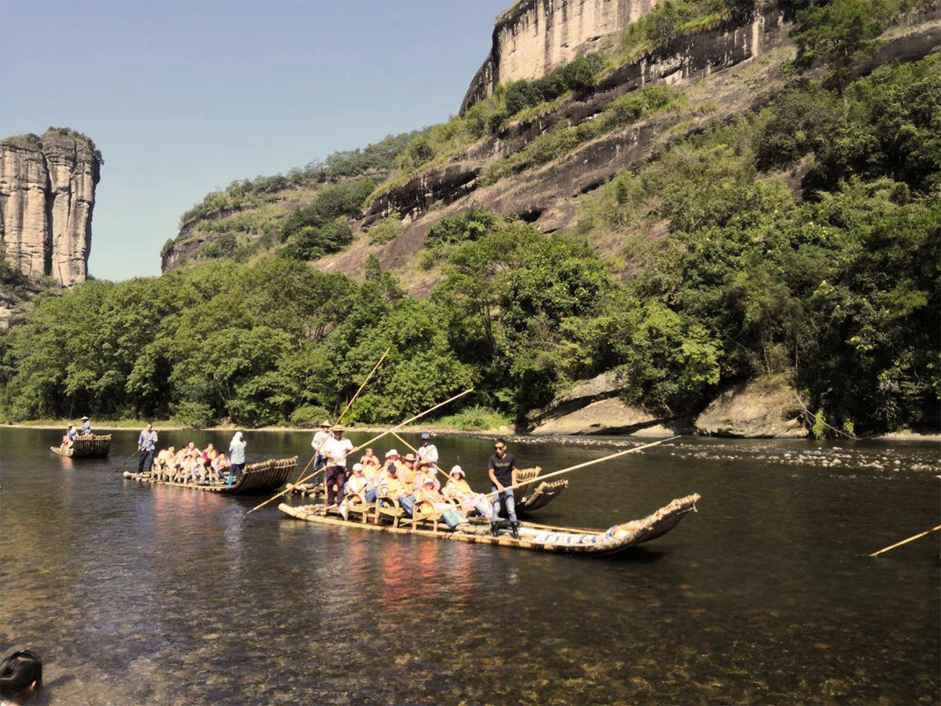 闽西北的武夷山碧水丹崖早就闻名于世,1997年国庆恰逢女儿于9月28日出嫁了,并随夫家去了南昌。我和养真约上她办公室的陈小新、谢瑞琼等同事,利用国庆休假去福建武夷山旅游。为何闽境内的名山以武夷命名,据说远在秦始皇宴请诸仙于幔亭峰上时,当时山上有一位逾八百岁的寿星,人称“彭祖”。他有二子,长子名武,次子曰夷。两兄弟开山造田,驱虎猎豹,造福于民,后人为纪念他们便将两人的名字连缀起来,为当地山水命名,取名武夷山。武夷山既有黄山之秀,又有庐山之峨;既有华山之险,又有泰山之伟。宋朝丞相李纲曾这样赞美它:“一溪贯群山,清浅萦九曲。溪边列岩岫,倒影浸寒绿。”