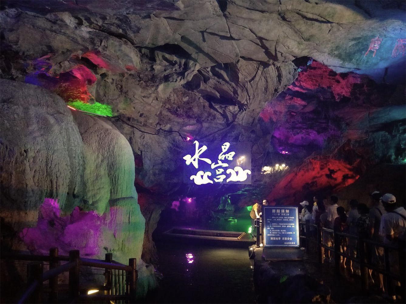 另一独特之处是洞内有水洞-地下暗河,而且喑河上有道道飞泉瀑布。游暗河要乘小舟,在一个洞中码头,我们上了小船,由一青年船工撑船,船在暗河中游动,两旁的石钟乳高低错落,倒映水中。泛舟水洞,微波轻漾,真是“船在山中行,桨在天上撑!”抬头仰望顶上的石钟乳上的水珠,时而滴落在暗河中,发出钢琴键单声跳动时清脆的鸣响。有时船工招呼大家弯腰低头,果然前面的洞顶钟乳低垂,要屈尊俯就,才能穿过,到另一个洞府,沿河曲折蜿蜒,奇幻莫测,山腹有洞,洞中有飞泉,泉尽是湖,湖水直通石河。船随水流,终于天见破晓,曙光又放,猛现云天,真是一个奇妙的善卷洞!