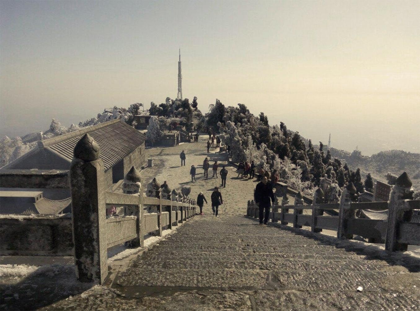 越往上走风越大,气温也更冷,雾气也更浓了,来到芙蓉峰,指路牌上标明此处海拔1148米,算来距海拔1290米的主峰-祝融峰高差142米。这时只见路边的树枝上挂满冰晶玉洁的粉状冰粒,唐。高骈在《对雪》一诗中赞曰:“六出飞花入户时,坐看青竹变琼枝。如今好上高楼里,盖尽人间恶路岐。”就描写雪花飞舞,竹木顿时化作玉叶琼枝,美不胜收的胜景。“朔风不折含霜枝”,有一处路两边的树均挂满琼枝玉叶,将路上方封闭只留下一个洞口,仿佛像水晶宫一样,蜿蜒数十米,这些琼枝挂的冰粉均向一个方向如珠帘似地飘起,十分有动感。陪同我们的长沙院的同志说:“这叫雾淞,树枝上挂的既非天上飘落的雪,也不是冻雨结成的冰,而是山里飘动的雾气里的水粉随风飘动遇冷空气结成冰粉一层层裹在树枝上形成的,所以有随风飘起的冰珠帘现象。唐。崔橹在《题云梦亭》一诗中就描写了这一奇观:“薄烟如梦雨如尘,霜景睛来却似春”。从半山亭上来,一直跟在我们后面的女山民搭话说:“你们运气好,早几天还不太冷,未形成雾淞,但若太迟上山,又因下雪结冰路太滑,又要封山了,这几天上山看努淞正好!”这位中年女山民其实是山脚下一家庭饭店的老板娘,上山来拉游客到他家饭店吃饭做生的,她这种推销生意的方式也很特别,看准后一直跟着,还义务她的谢意,同意到她家饭店用餐。一路上经过邺侯书院、隐松古洞、黄帝岩、南天门、狮子岩、望日台等景点。