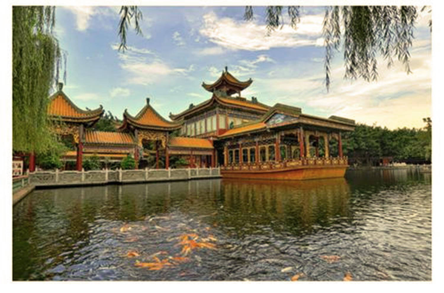 过了汇源桥与清平湖隔着长廊是荷花池,这里荷花尚未开放,但一顷绿荷也很有气势。唐李商隐在《赠荷花》一诗中赞道:“世间花叶不相伦,共入金盆叶作尘,唯有绿荷红菡萏,卷舒开合任天真。”在双清桥头我们上了荔景湾的画舫,轻舟在水面逍遥放棹,湖中心的荔岛上玉堂春瑞,柳剪春风,仿似置身蓬瀛,岛端的聚宝阁掩映在绿树丛中。穿过荔景桥,左岸的八仙过海雕塑群就在眼前,这里是一派“一湾碧水轻舟泛,两岸垂杨画阁浮。”的景象。穿过聚宝桥,眼前是一个宽阔的水面,正前方是观景楼,右边一座九曲桥围着三叠飞泉的假石山。画舫回游至登舟处上了岸,在右边沿长廊回走,在长廊边有一间青铜器文物陈列室,进入陈列室我被这里的展品震撼了,这里的青铜器外形高大,有古鼎、古香炉、青铜的武士,和神龟、神像以及宝剑、大刀、长矛等兵器。一看介绍才回忆起我在电视节目中看到的这批国宝级文物,回归祖国的传奇故事。