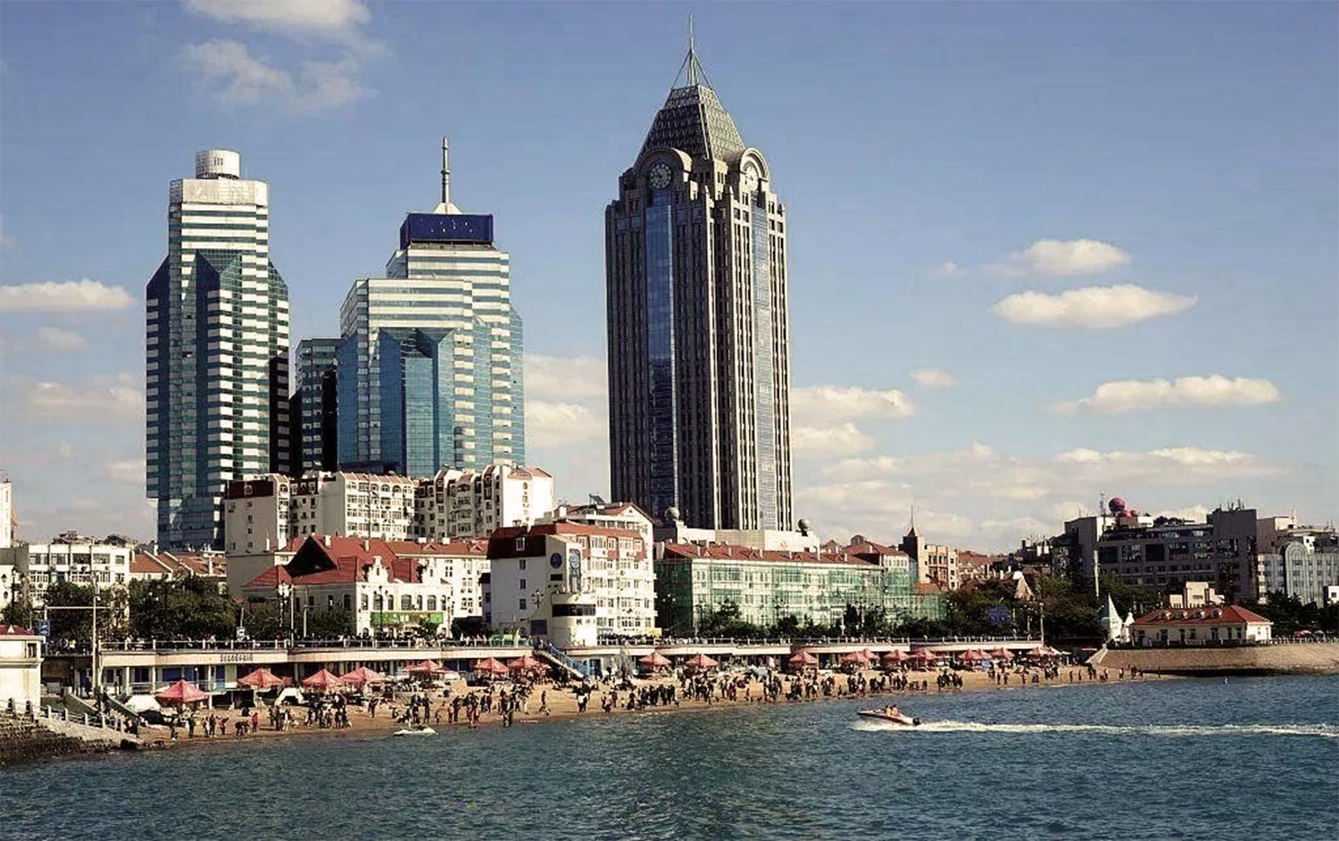 路过鲁迅公园,海产博物馆来到坡缓沙细,水清浪静而著称的第一海滨浴场,这海湾东西长约580米,宽达40多米的细沙滩向海内延伸到极远处。由于汇泉角的阻隔使进入湾内的涌浪渐次衰减,因而形成了浪高仅1米左右的平静海面。这里风景优美,远处狭长的汇泉角,浪打红礁,绿荫遮地;幽静的八大关,花木掩映,楼影朦胧;而近处的海滩,碧浪金沙,形如弯月,一幢幢更衣室,五颜六色,精巧玲珑。宽阔的沙滩上挤满了人群,人们裸露的肌肤,色彩斑斓的泳装,成排的遮阳伞,以及海水中欢乐嘻笑的人们,构成一派生动迷人的景象。