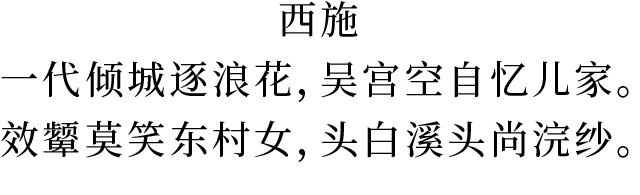 苏州是春秋时期吴国都城,当时吴、越两国打得难解难分,先是越王把吴王阖闾打死,阖闾的儿子夫差继承王位又击败越王勾践。勾践用计,表面上俯首称臣,实际上卧薪尝胆,发愤图强,传说还施展美人计,通过范蠡将越国美女西施献给吴王夫差,诱使夫差荒淫无度,慵懒国事而亡国。如今闾门西南30华里的灵岩山上有灵岩寺,据传原是吴王夫差为西施所筑“馆娃宫”,山上还有西施洞、玩月池、吴王井、梳妆台、砚池等也都与西施有关系。西施为中国四大美女之首,红楼梦中第64回有林黛玉写的五美吟之一赞她:
