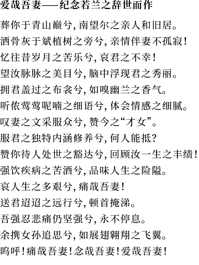 本来我打算牵着她的手“慢慢地变老”,走完这漫漫人生历程。但她却过早地离我们而去。但我会坚强地活下去,记住她的音容笑貌,走完这人生最后的旅程。若兰你走好!若兰你安息吧!