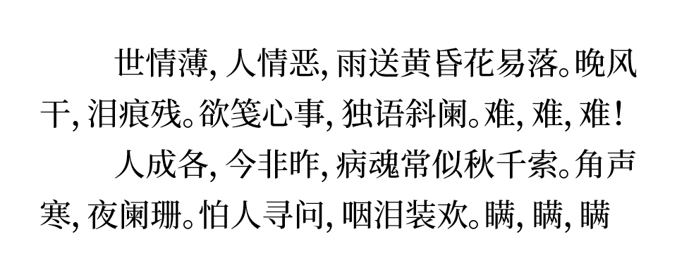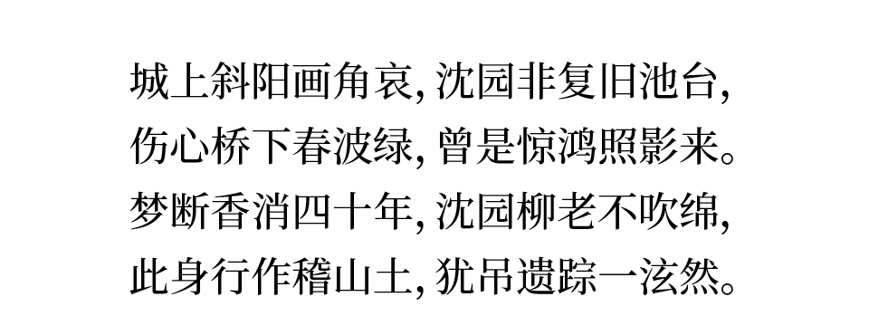 十年后陆游重游沈园,巧遇唐婉夫妇,二人蓦然相逢,恍若隔世,离情别绪一齐涌上心头。唐婉这时已嫁作他人之妇,只能让下人送酒肴给陆游略表心意,陆游饮下这杯苦酒,百感交集,于是挥笔在沈园的粉墙上题下一首荡气回肠的词《钗头凤》: